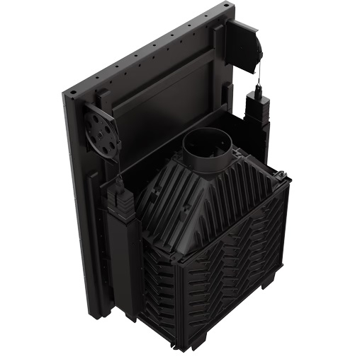 Zásuvka/nádoba na popol na zber spálených zvyškov dreva a pohyblivý rošt, ktorý uľahčuje vyberanie popola. Veľká spaľovacia komora, ktorá umožňuje naložiť veľké množstvo paliva naraz bez toho, aby ste ho museli často dopĺňať. Zníženie usadzovania sadzí vďaka systému čistého skla (vzduchový deflektor). Elegantná a pohodlná rukoväť. Možnosť vyrovnania vložky vďaka nastaviteľným nožičkám. Dvojitý systém otvárania dverí hore (GUILLOTINE) a do strany. Vyvýšené a znížené dvierka uľahčujú nakladanie dreva a mechanizmus bočného otvárania umožňuje efektívnejšie čistenie skla.