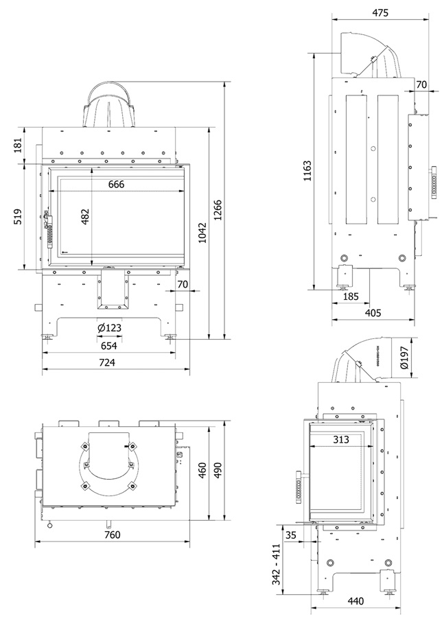 Spaľovacia komora je obložená materiálom Termotec, ktorý zabezpečuje efektívne spaľovanie, akumuluje teplo a zvyšuje teplotu v peci. Nový dizajn - drážkovaný povrch dodáva krbu eleganciu a moderný charakter.