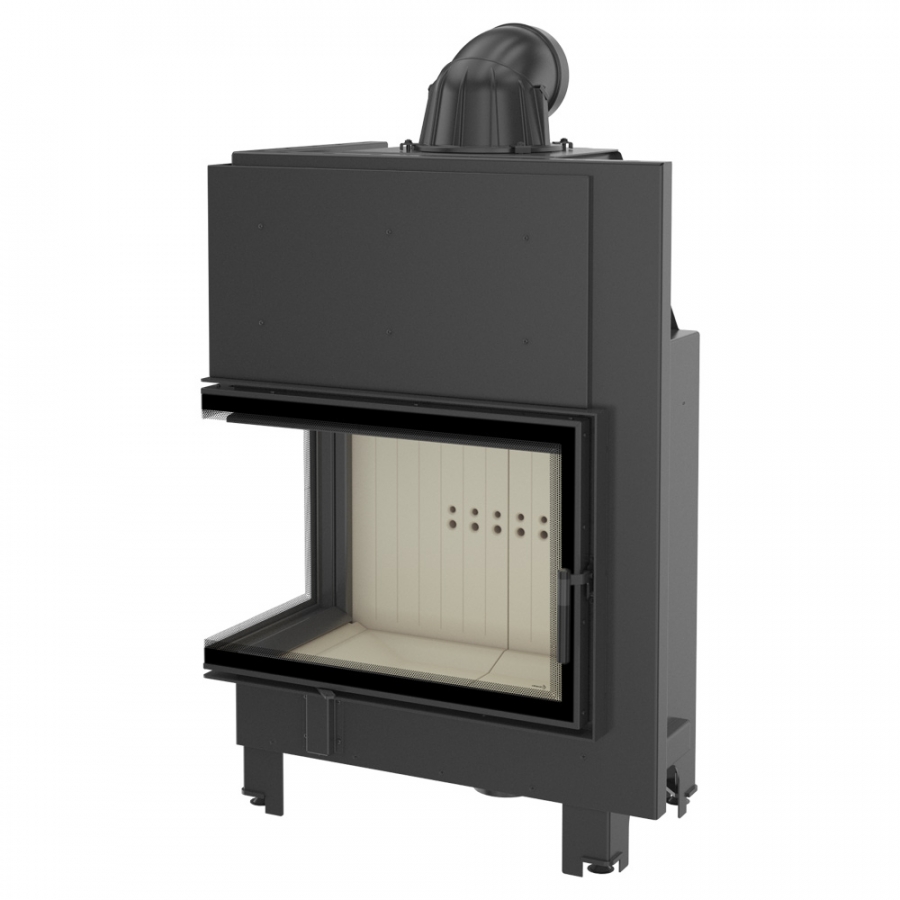Rohová krbová vložka s ohýbaným sklom.