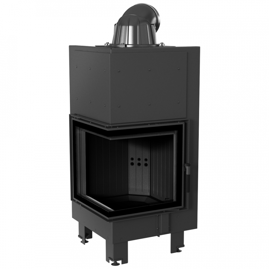 Rohová krbová vložka so sklami spájanými pod 90° uhlom.