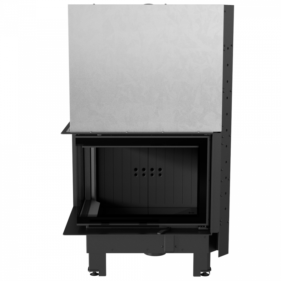 Rohová krbová vložka so sklami spájanými pod 90° uhlom.