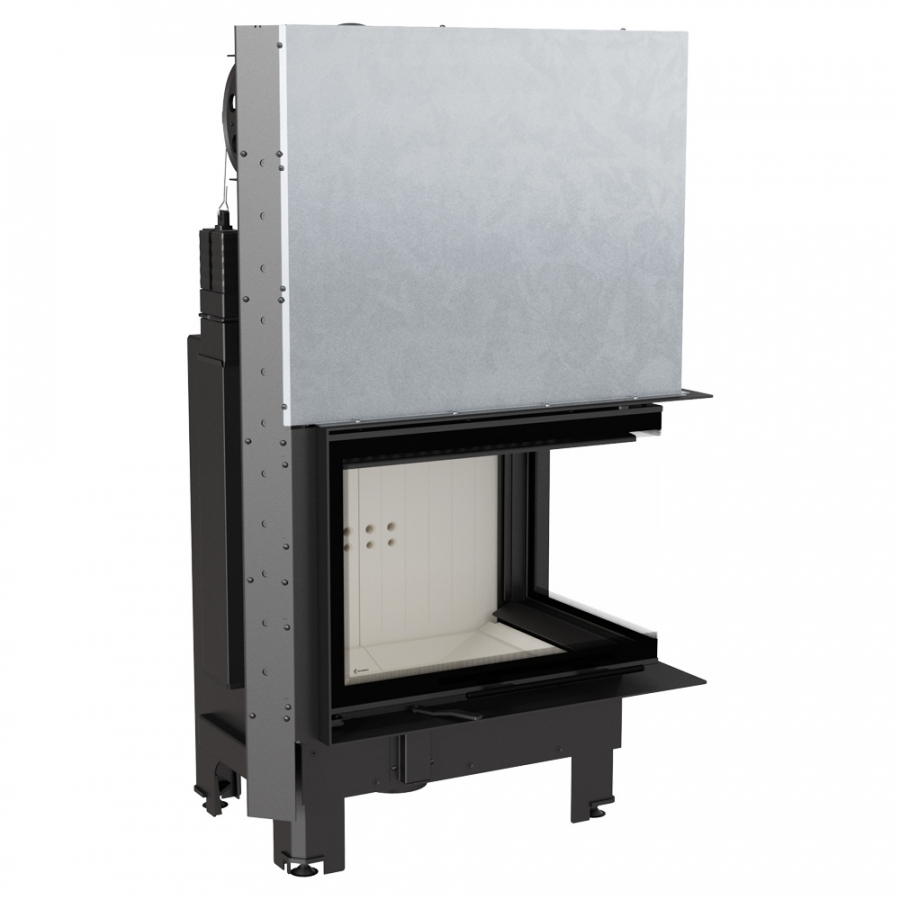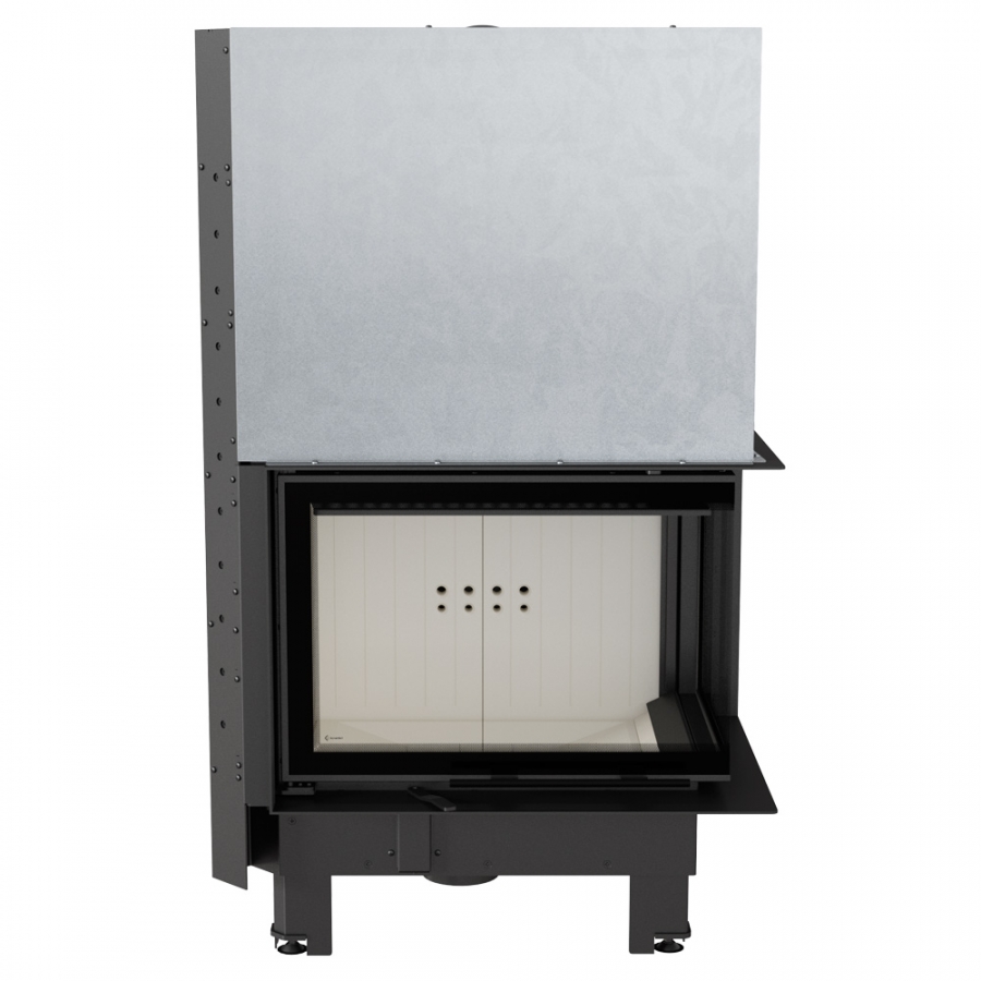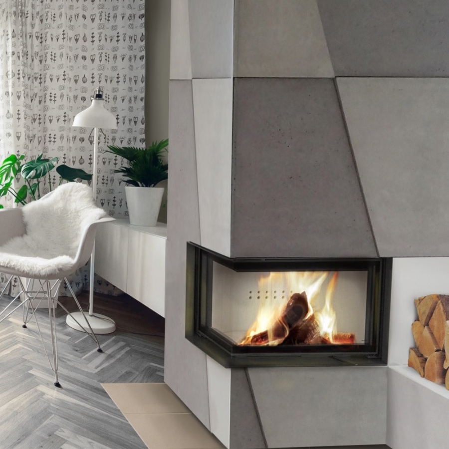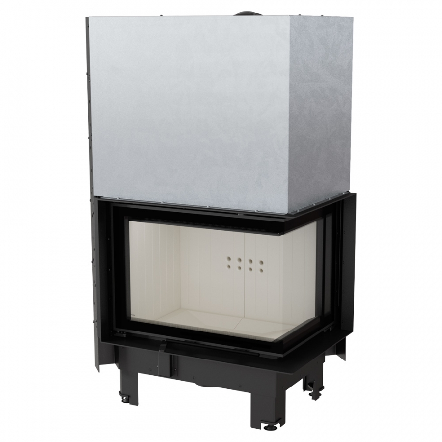 Rohová krbová vložka so sklami spájanými pod 90° uhlom.