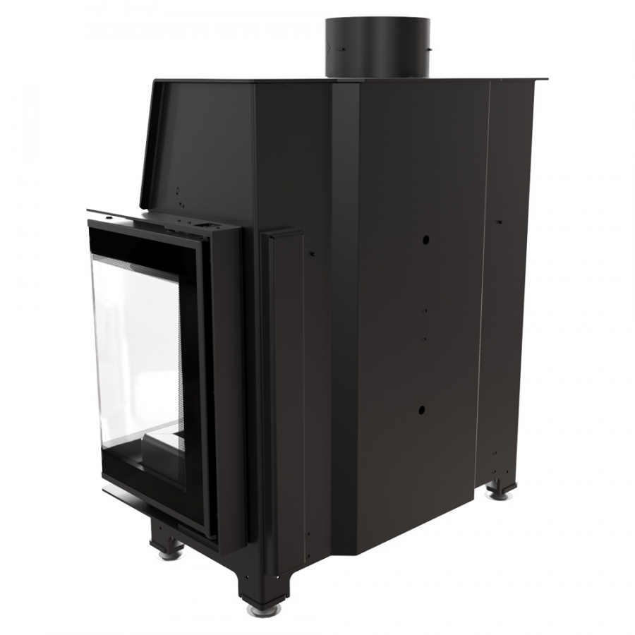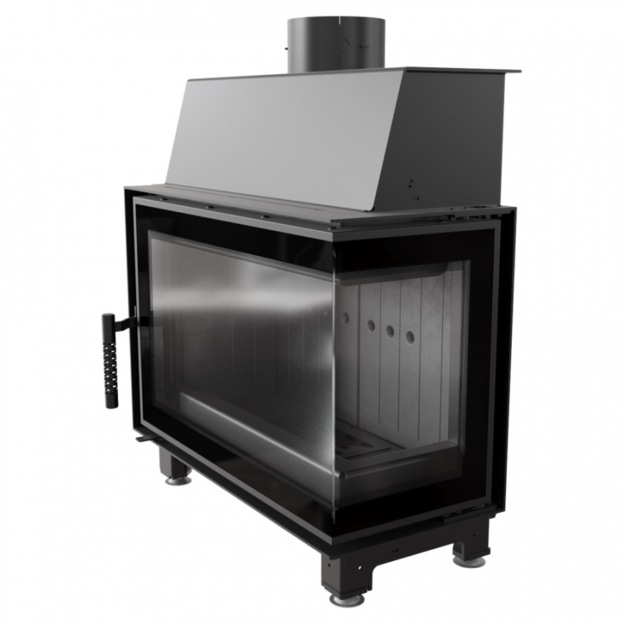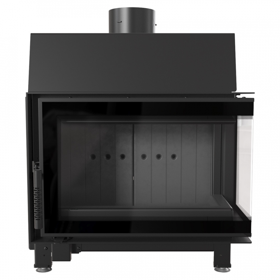 Rohová krbová vložka so sklami spájanými pod 90° uhlom.