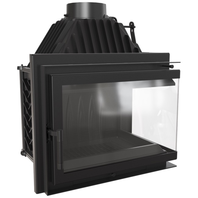 Rohová krbová vložka s dvierkami typu BS (bez rohového stĺpika) s deleným sklom.