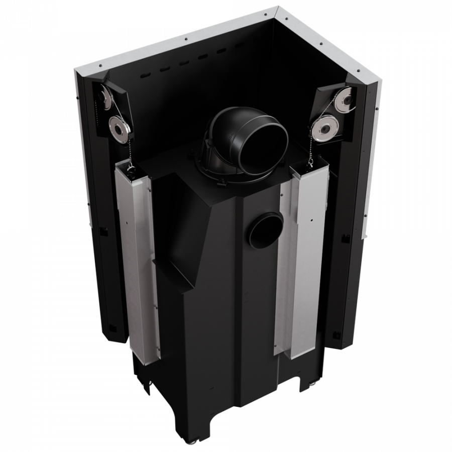 Krbová vložka s výsuvným otváraním dvierok - systém lift-up. Tento systém je postavený na základe protizávažia - kladka s oceľovým lankom je vedené na dvoch guľkových ložiskách, vďaka čomu je váha dverí rovnomerne rozdelená. Výsuv dverí je niekoľko milimetrov od tela, čo zabraňuje poškodeniu tesnenia a dvierka sa pri zatvorení silne zatlačia, vďaka čomu je spaľovacia komora úplne utesnená.