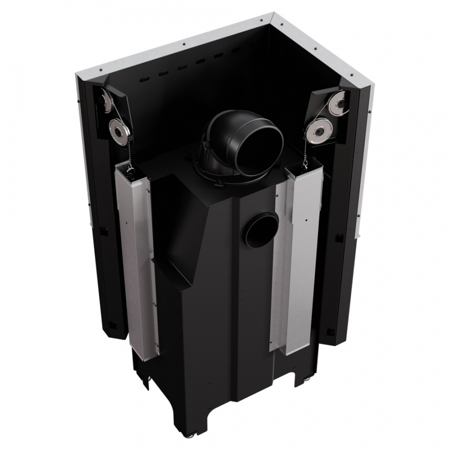 Krbová vložka s výsuvným otváraním dvierok - systém lift-up. Tento systém je postavený na základe protizávažia - kladka s oceľovým lankom je vedené na dvoch guľkových ložiskách, vďaka čomu je váha dverí rovnomerne rozdelená. Výsuv dverí je niekoľko milimetrov od tela, čo zabraňuje poškodeniu tesnenia a dvierka sa pri zatvorení silne zatlačia, vďaka čomu je spaľovacia komora úplne utesnená.