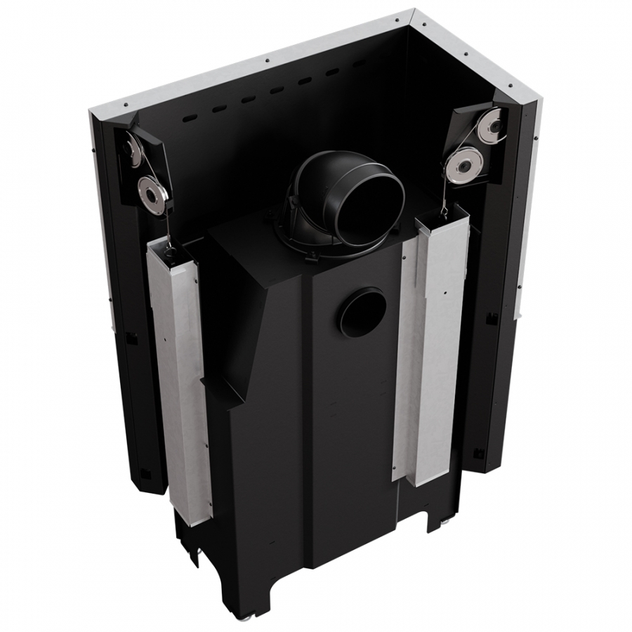 Krbová vložka s výsuvným otváraním dvierok - systém lift-up. Tento systém je postavený na základe protizávažia - kladka s oceľovým lankom je vedené na dvoch guľkových ložiskách, vďaka čomu je váha dverí rovnomerne rozdelená. Výsuv dverí je niekoľko milimetrov od tela, čo zabraňuje poškodeniu tesnenia a dvierka sa pri zatvorení silne zatlačia, vďaka čomu je spaľovacia komora úplne utesnená.