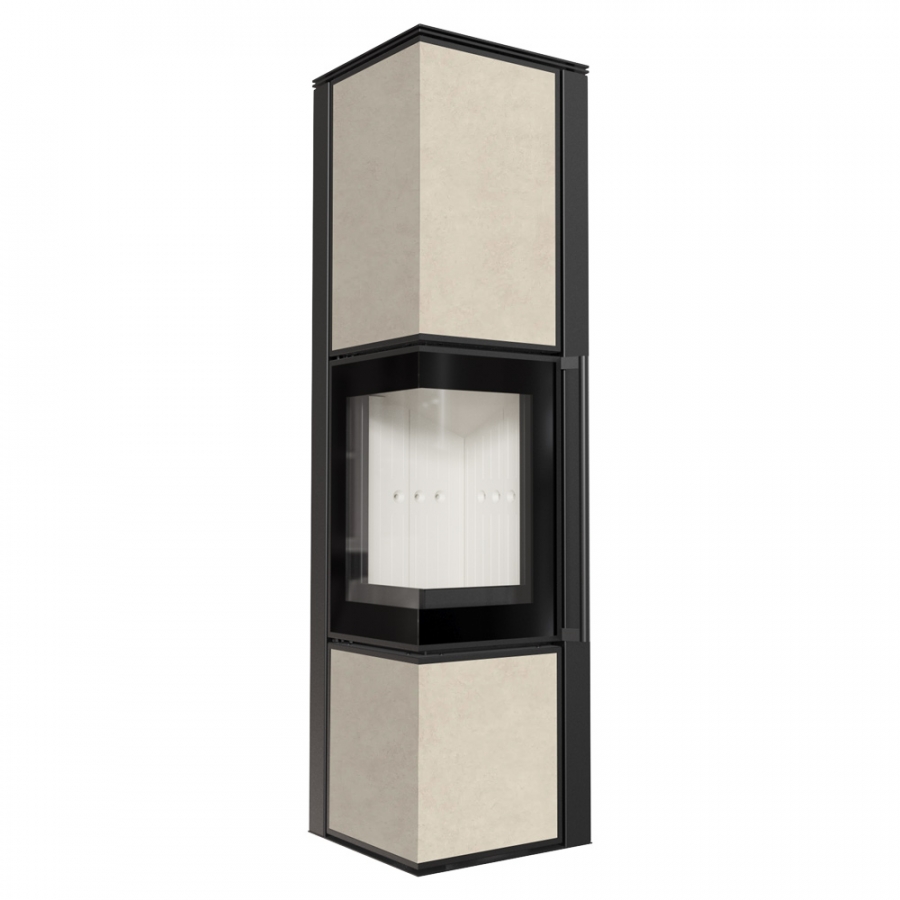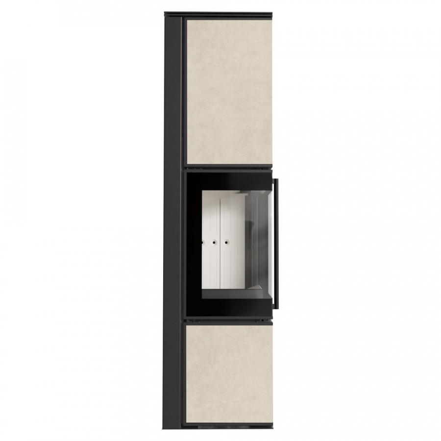 TORA vo veľkosti L sú oceľové kachle s povrchovou úpravou sintrovanou kremennou doskou v elegantnej farbe a obojstranným presklením.
