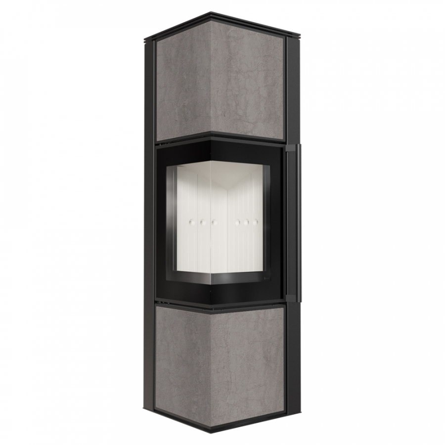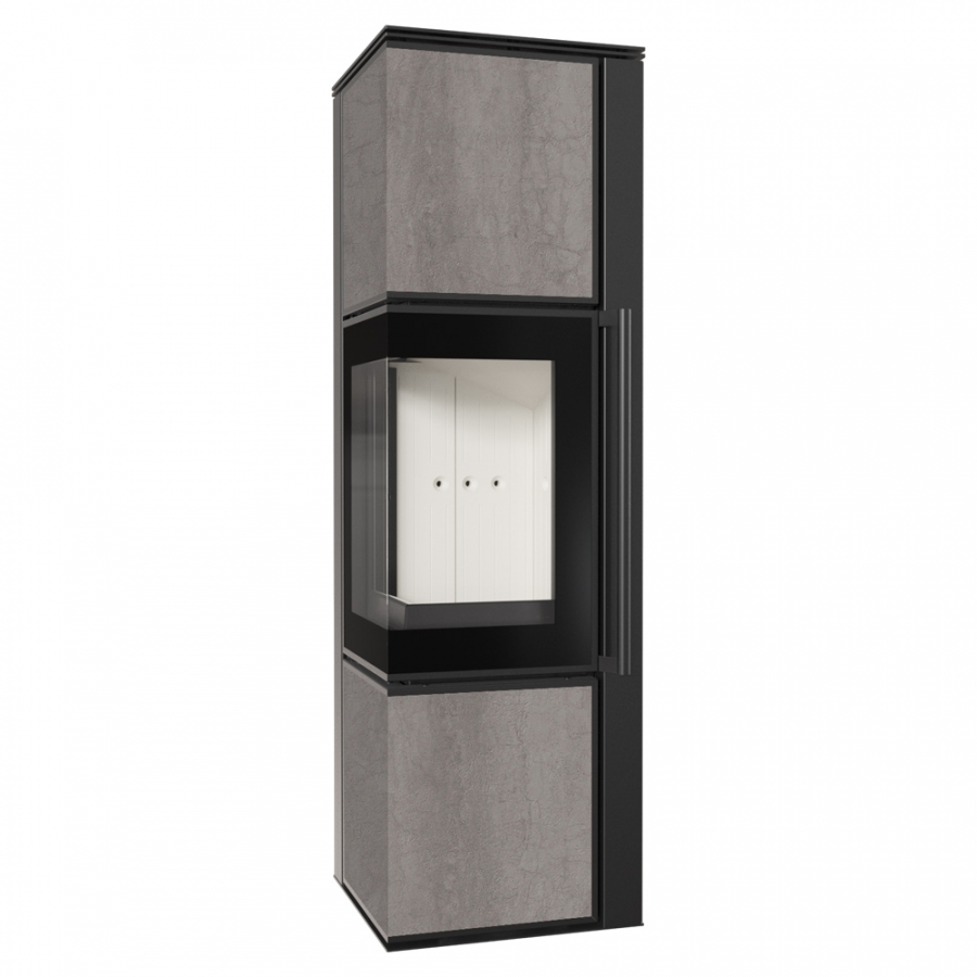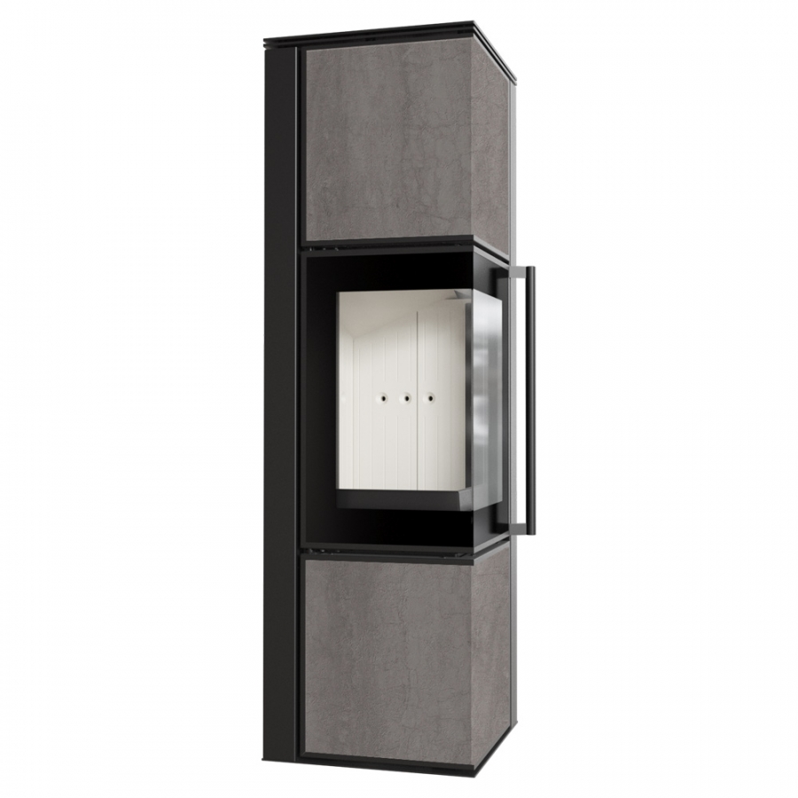 TORA vo veľkosti M sú oceľové kachle s povrchovou úpravou sintrovanou kremennou doskou v elegantnej farbe a obojstranným presklením.