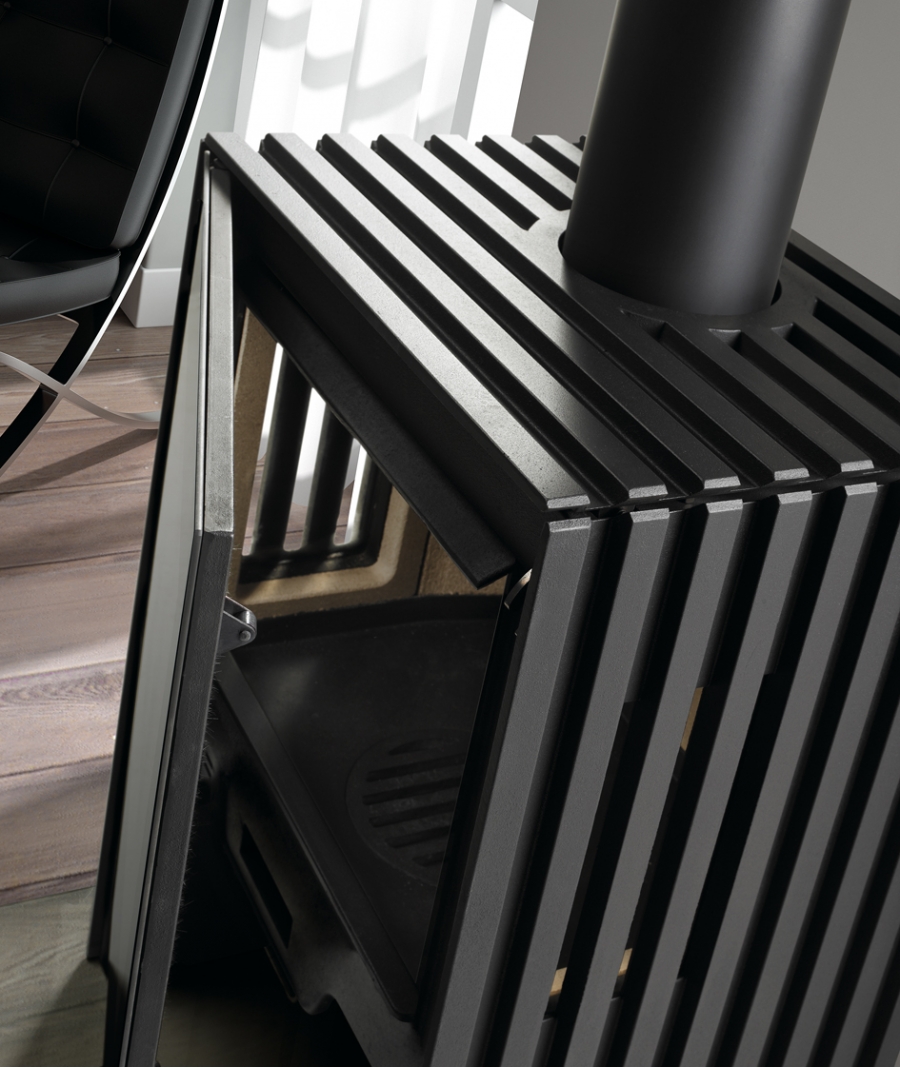 Pohľad na blikajúce plamene si môžete vychutnať z každej strany miestnosti - kachle sú na bočných stranách presklené. Záujme aj liatinová rebrovaná konštrukcia, ktorá robí kachle výnimočnými a nemali by chýbať v žiadnej súčasnej domácnosti.