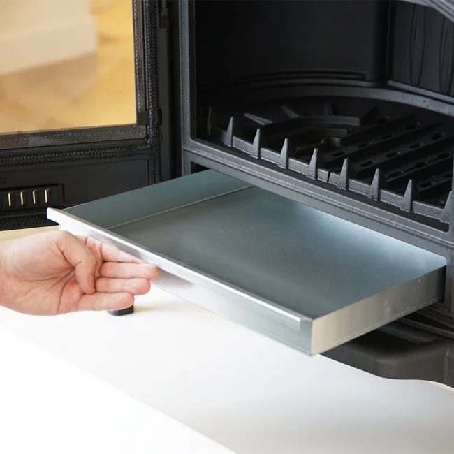 Zásobník na popol s pohyblivým roštom, ktorý uľahčuje odstraňovanie popola.