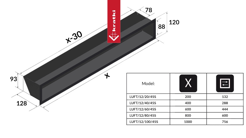 Krbová mriežka LUFT 45S sa inštaluje na krbové obstavby a je estetickým zakončením otvorov potrebných na prúdenie vzduchu v krbe. Vďaka svojmu dizajnu je ideálna pre moderné interiéry. Charakteristickým črtom modelu LUFT 45S je maskovaný otvor mriežky - cez krbovu mriežku nie je vidno do krbovej obstavby, no napriek tomu zabezpečuje optimálne prúdenie vzduchu. Musí byť však dodržaná správna montáž: ak umiestňujete mriežku nad krbovou vložkou, ktorá má slúžiť na výdaj teplého vzduchu, otočte mriežku otvorom smerom dole. Ak umiestňujete mriežku pod krbovou vložkou, ktorá má slúžiť na príjem chladného vzduchu, otočte mriežku otvorom smerom hore. Pamätajte tiež na minimálnu požadovanú veľkosť jednotlivých mriežok podľa výkonu krbovej vložky. Mriežky sú farbené práškovou metódou, čím sú odolné voči vysokým teplotám i mechanickému poškodeniu. Záruka 24 mesiacov.