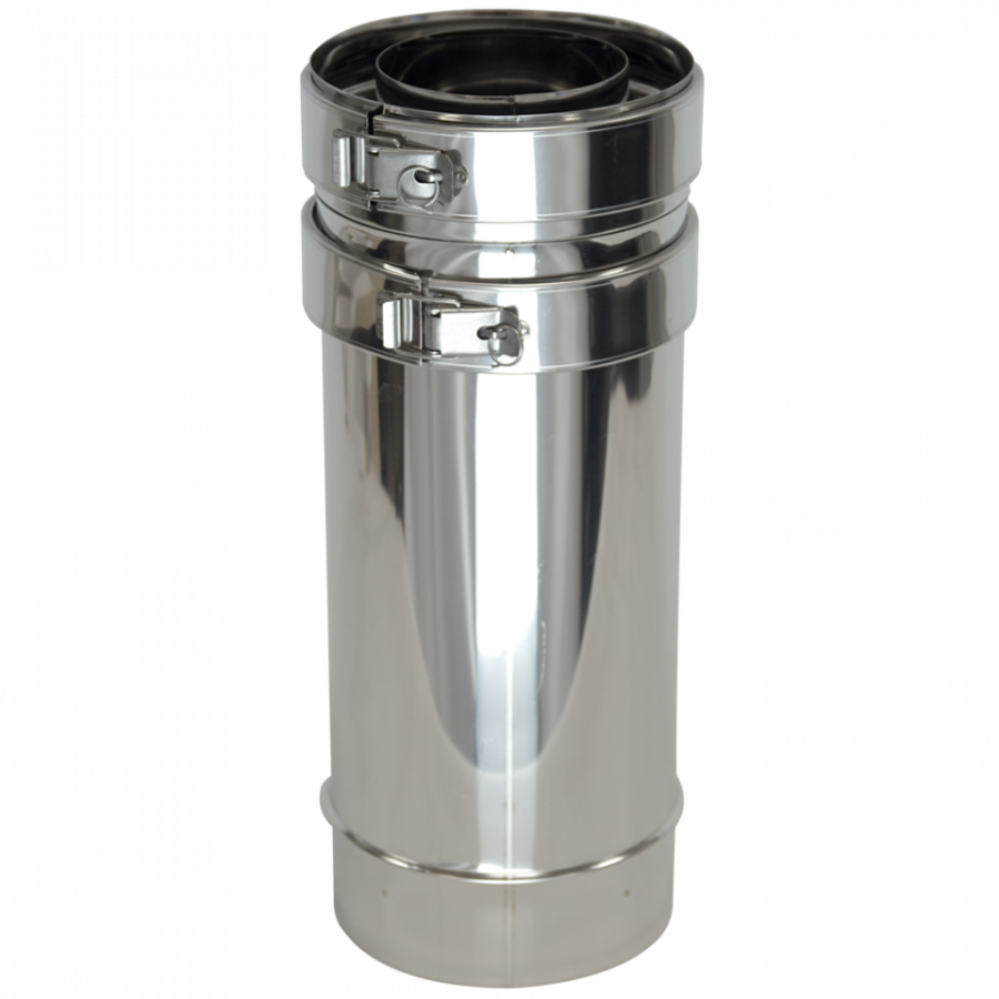 Dvojstenná koncentrická rúra na odvod spalín z plynových krbov je vyrobená z ocele odolnej voči kyselinám s možnosťou nastavenia dĺžky 390 - 640 mm.