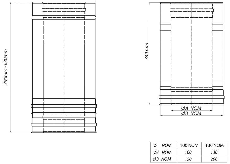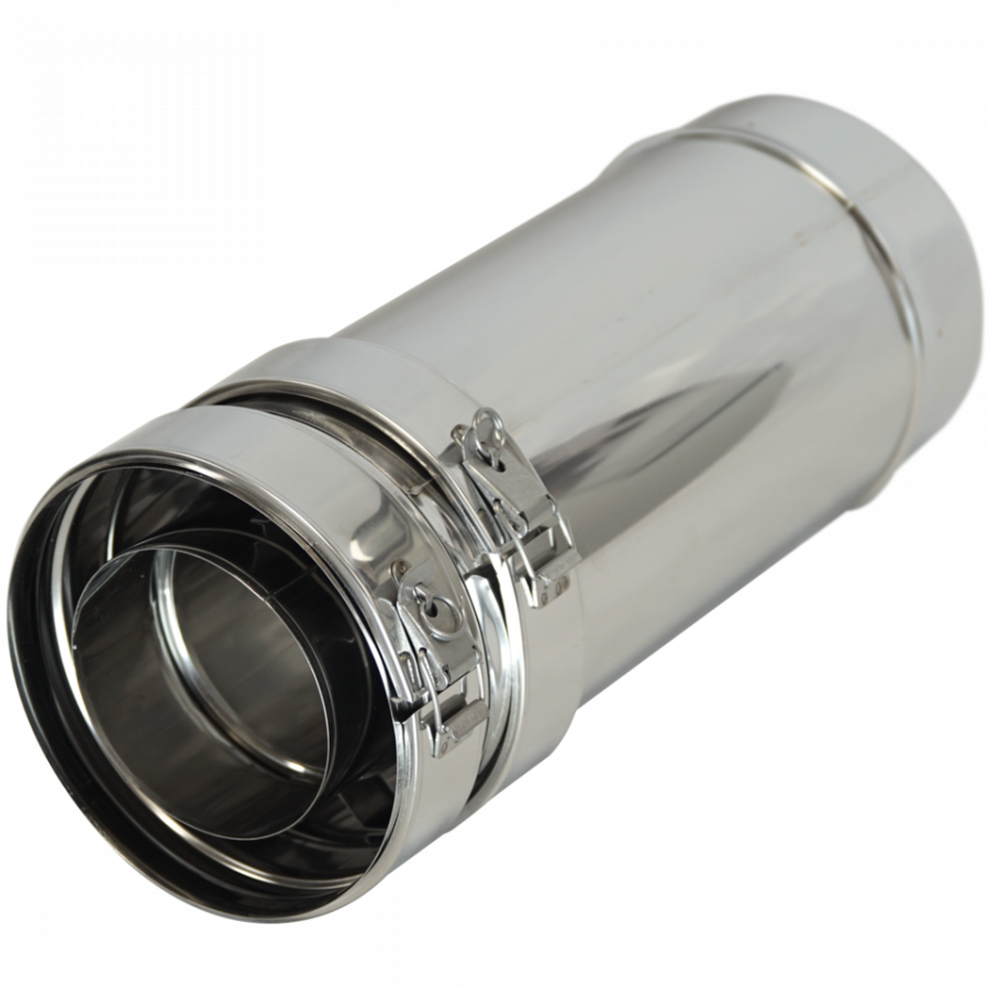 Dvojstenná koncentrická rúra na odvod spalín z plynových krbov je vyrobená z ocele odolnej voči kyselinám s možnosťou nastavenia dĺžky 390 - 640 mm.