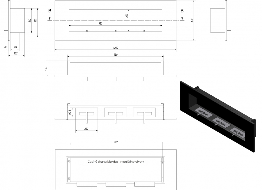 Závesný biokrb Delta 3 čierny 1200x400mm